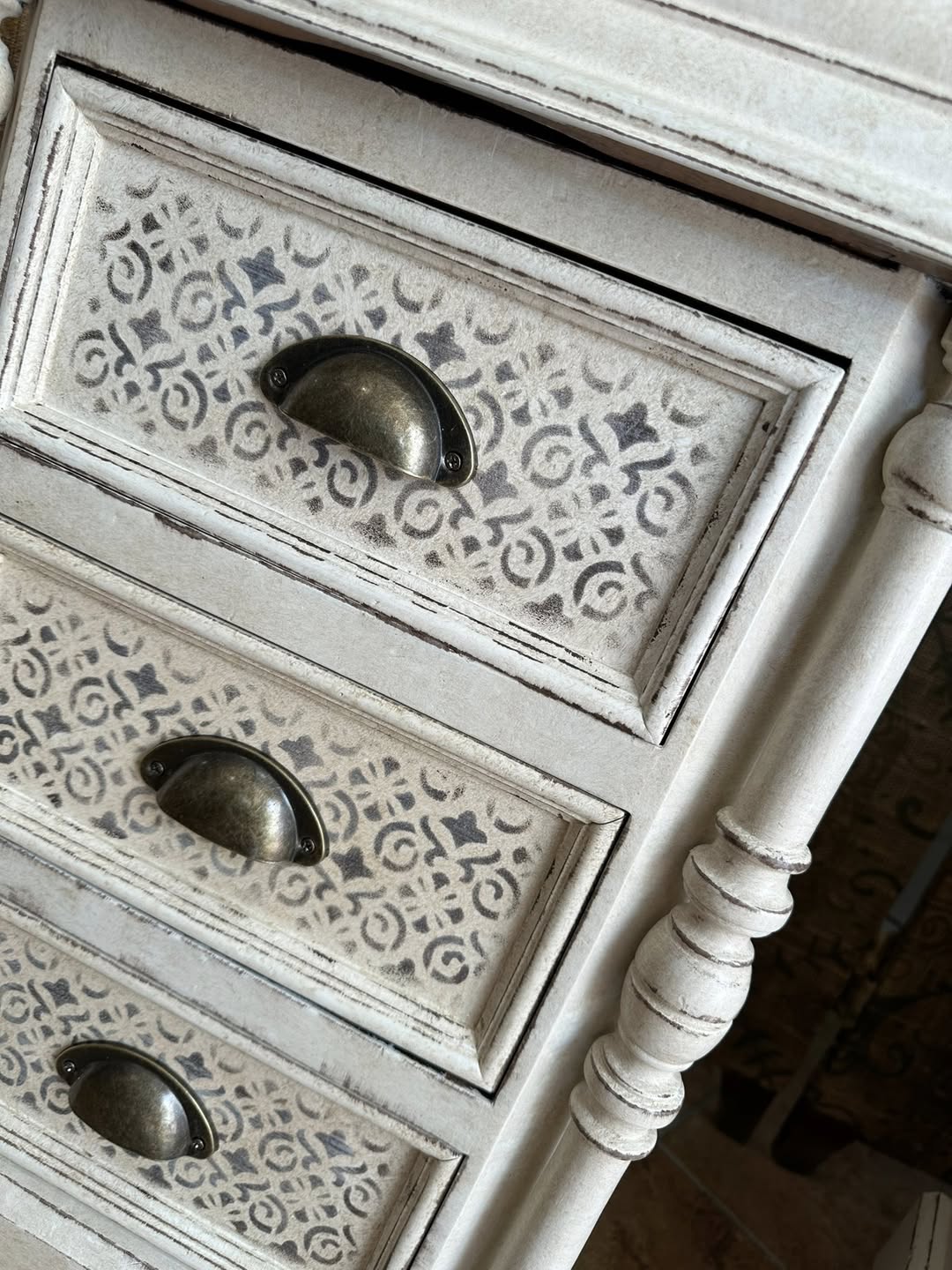 Mesita de noche restaurada en un color blanco roto envejecido con un patrón geométrico.