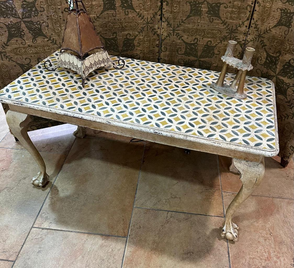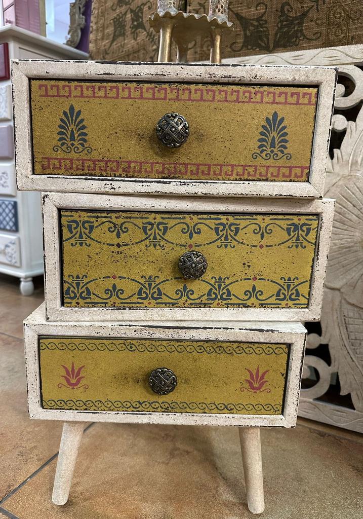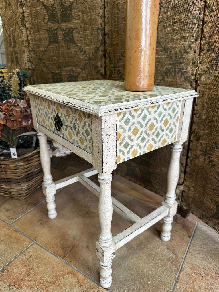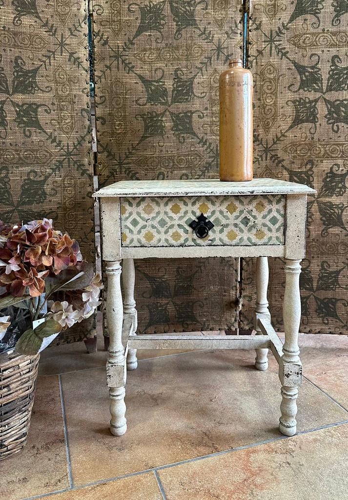 Mesita auxiliar restaurada dando un toque especial y único ocn pintura en lanco roto envejecido y cenefas en tonos cálidos.