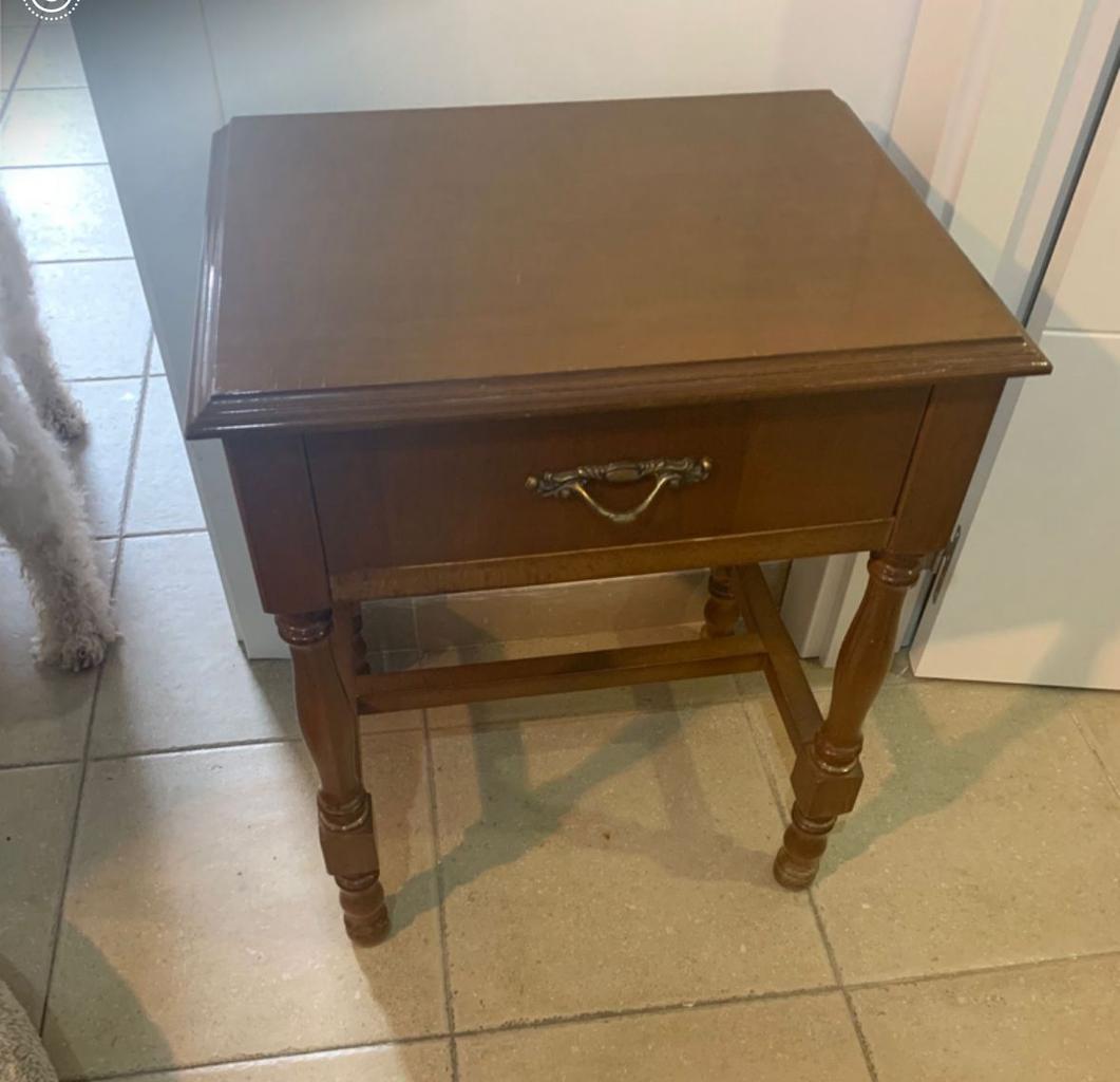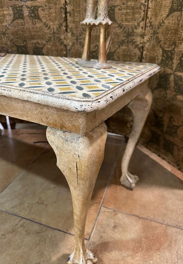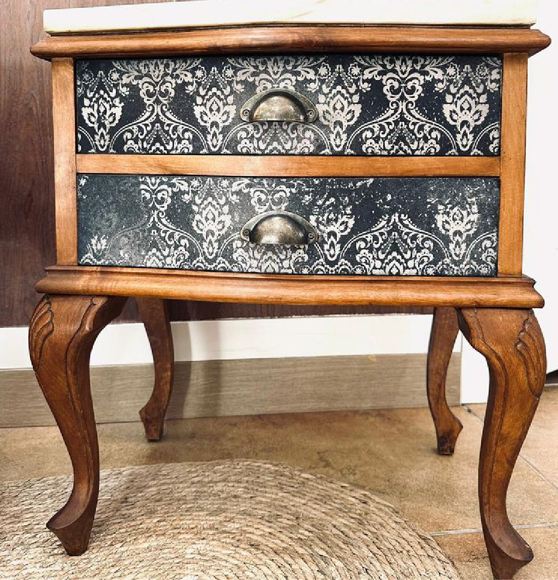 Mesita auxiliar restaurada dando un toque especial y único ocn pintura en lanco roto envejecido y cenefas en tonos cálidos.