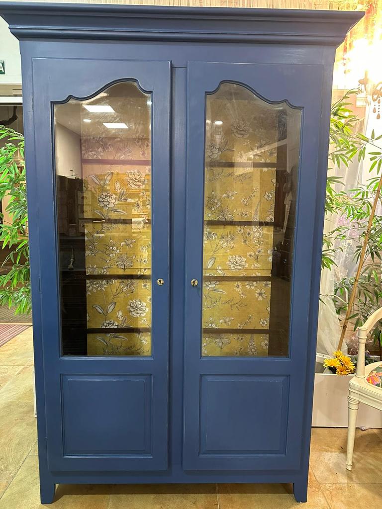 Vitrina de madera pintada en azul cobalto y colocación de papel decorativo en su interior